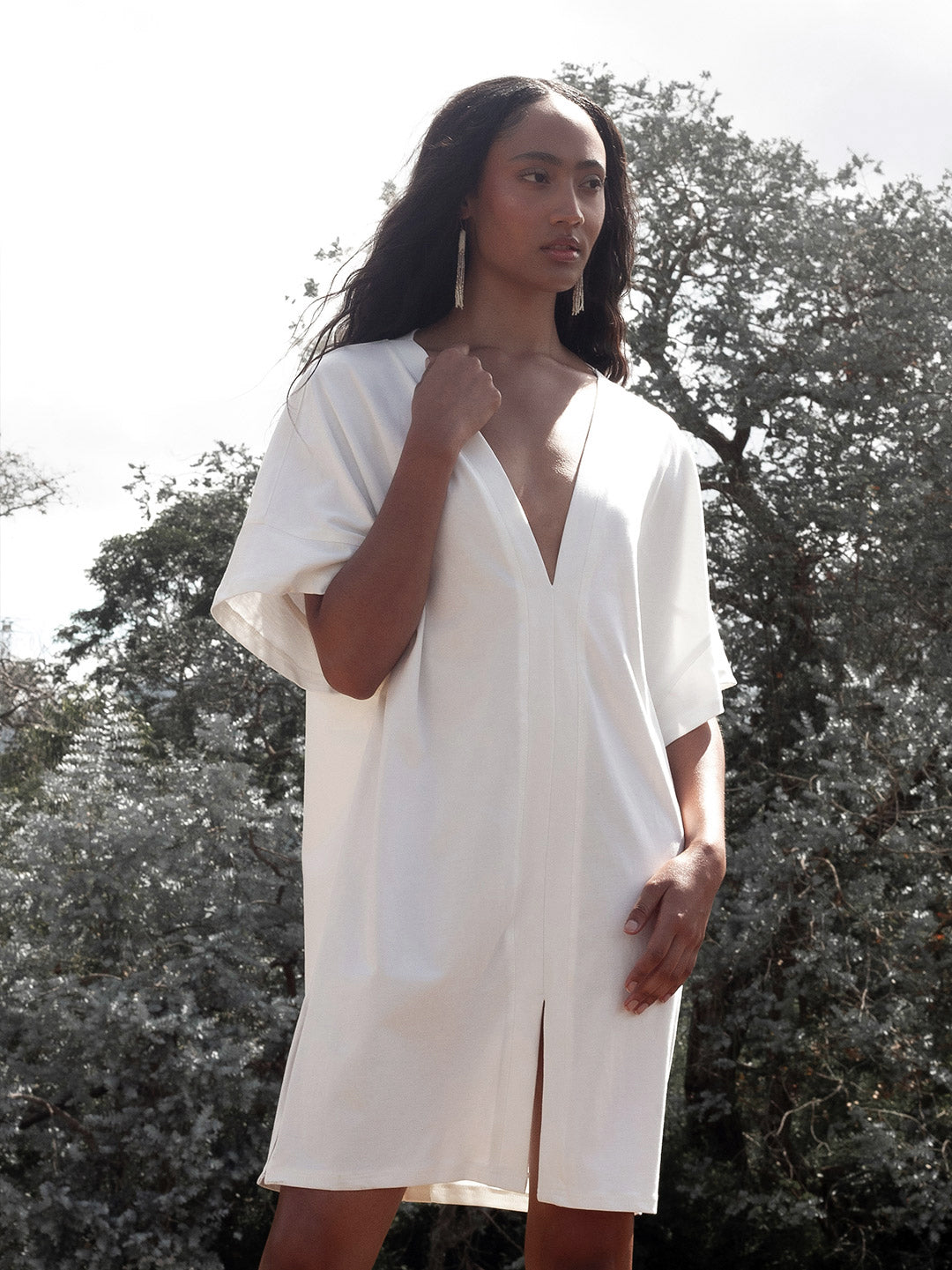 Blusón sin género en tejido de punto, confeccionado en hilo 100 % algodón. Diseñado con escote en V, mangas rodadas, aberturas en costados y delantero, y perilla delantera y posterior.
