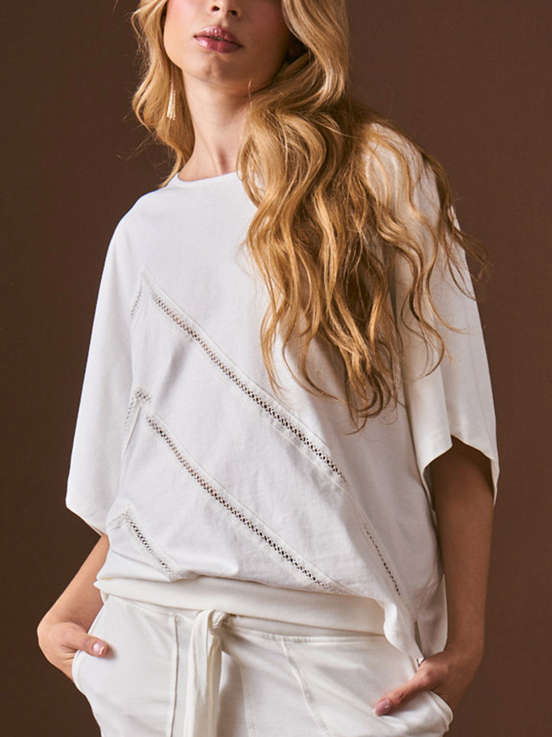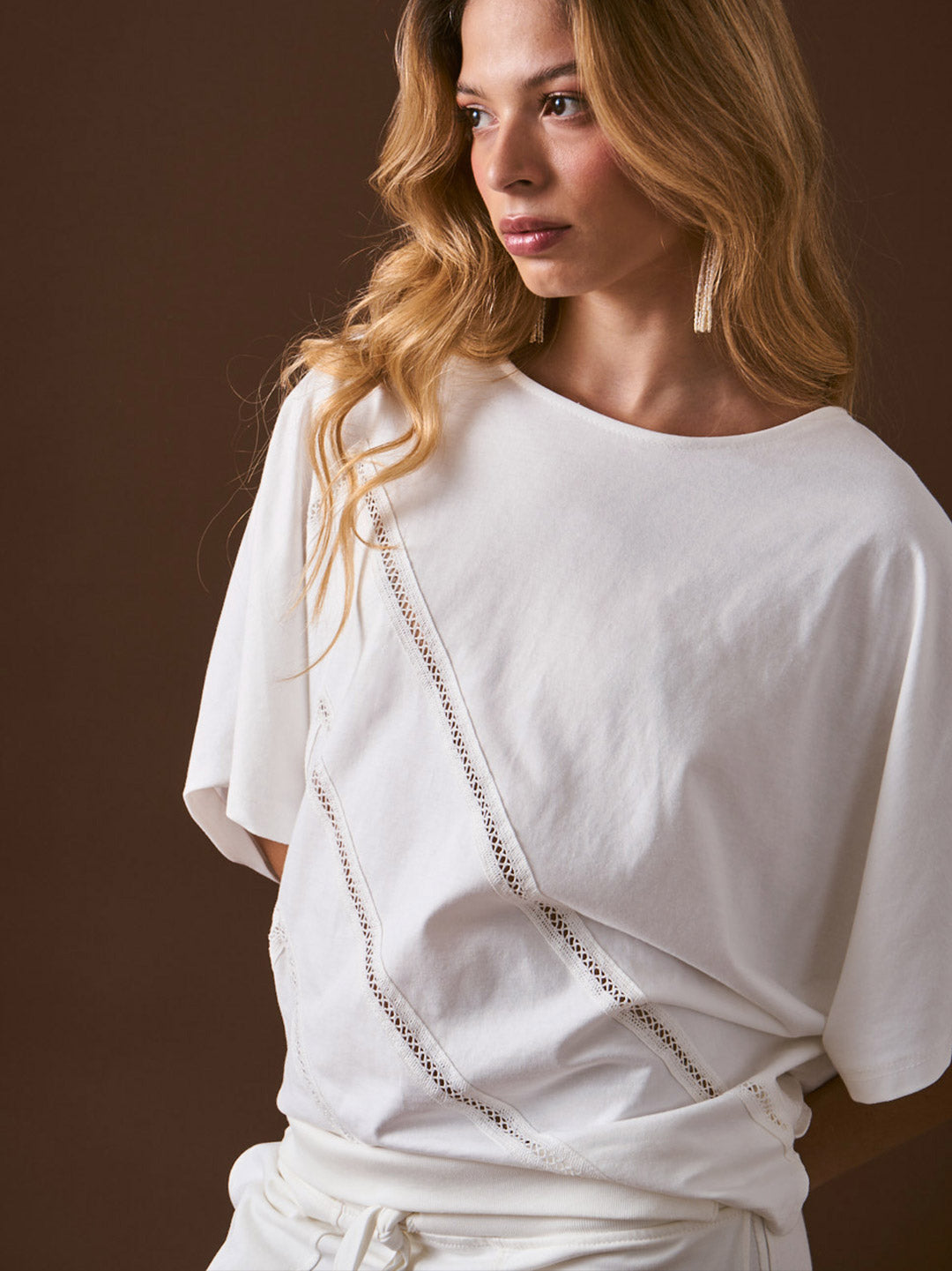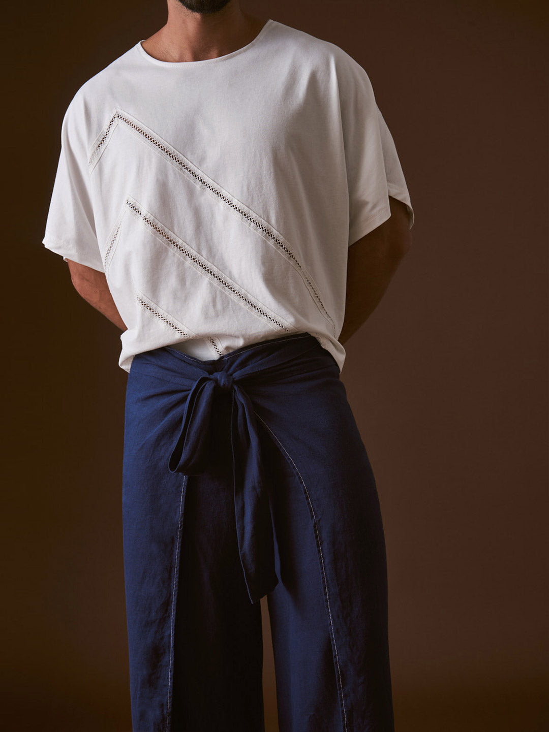 Camiseta sin género, hecha en tejido de punto y confeccionada en hilo 100 % algodón. Diseñada con cortes diagonales asimétricos que se unen con un insumo tipo bolillo de algodón.