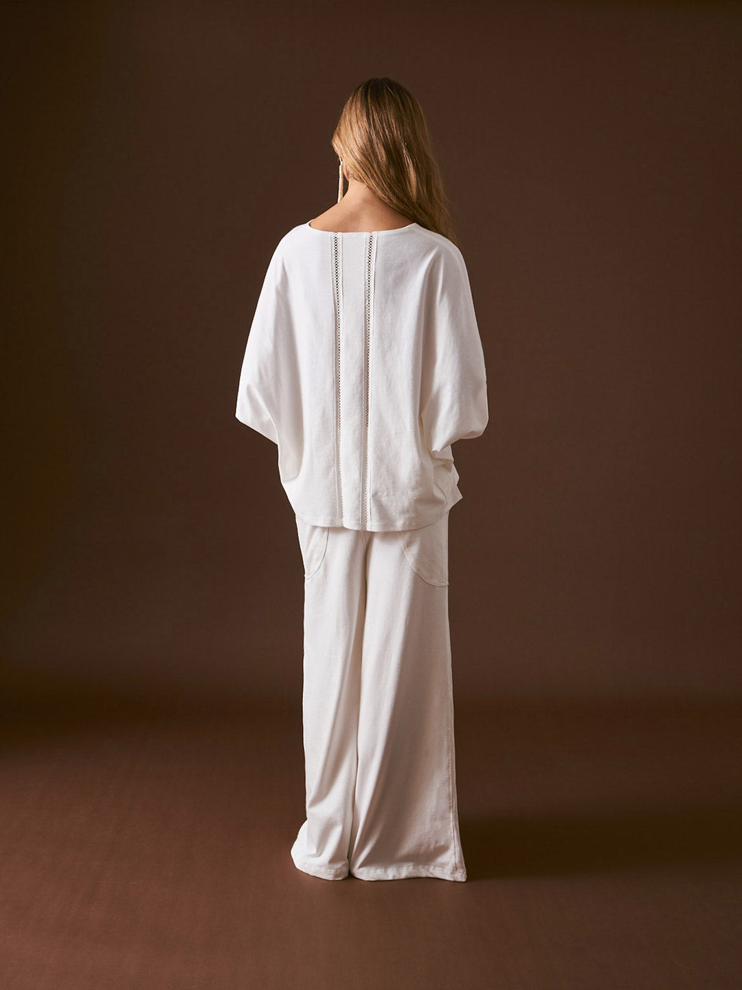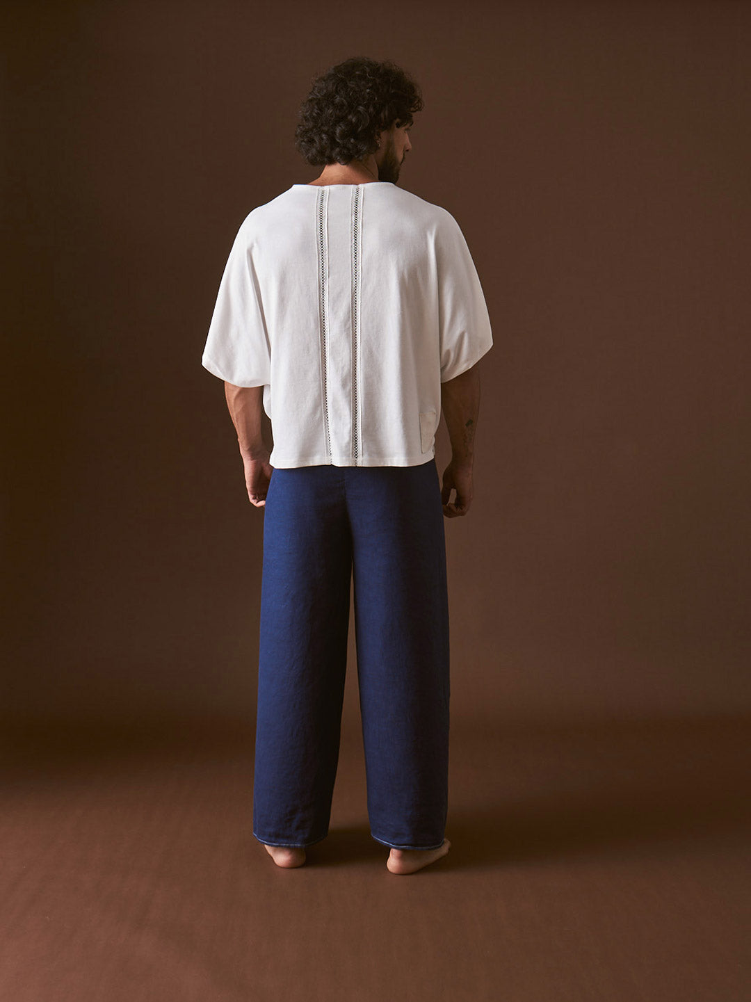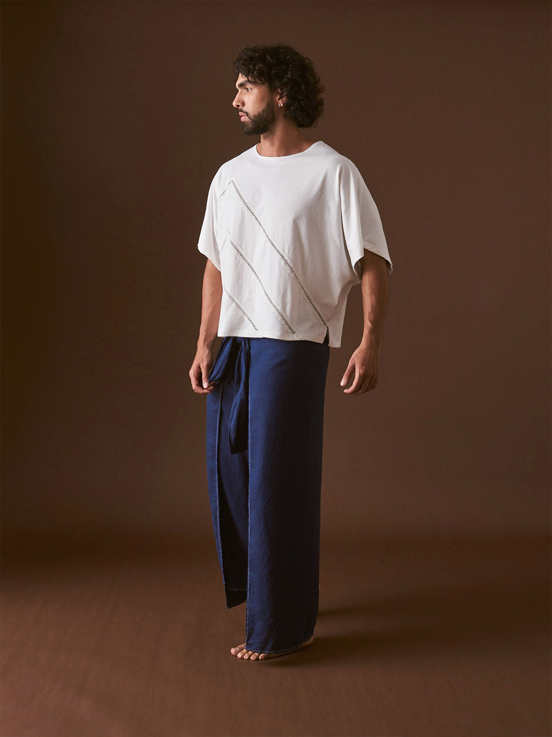 Camiseta sin género, hecha en tejido de punto y confeccionada en hilo 100 % algodón. Diseñada con cortes diagonales asimétricos que se unen con un insumo tipo bolillo de algodón.
