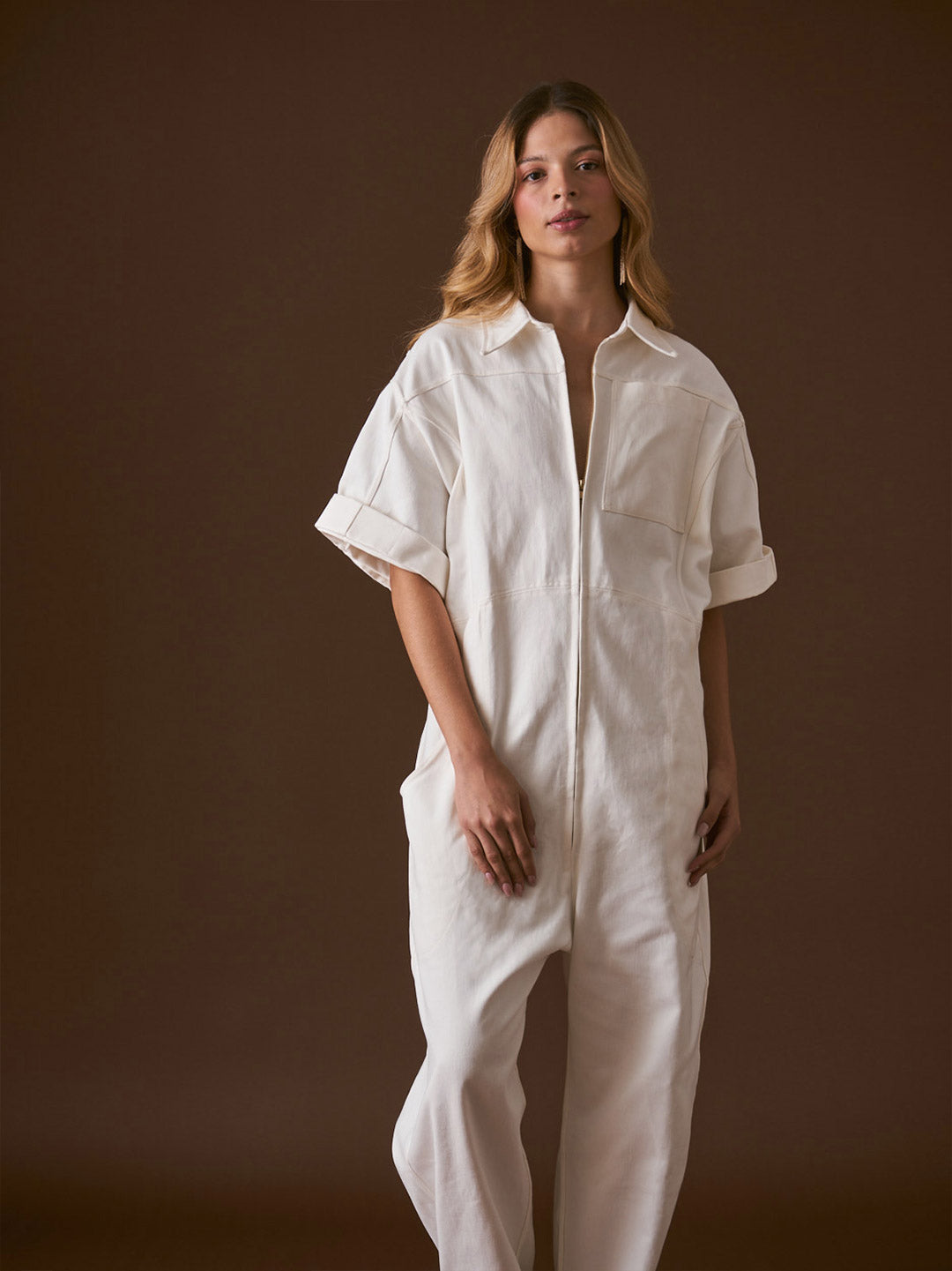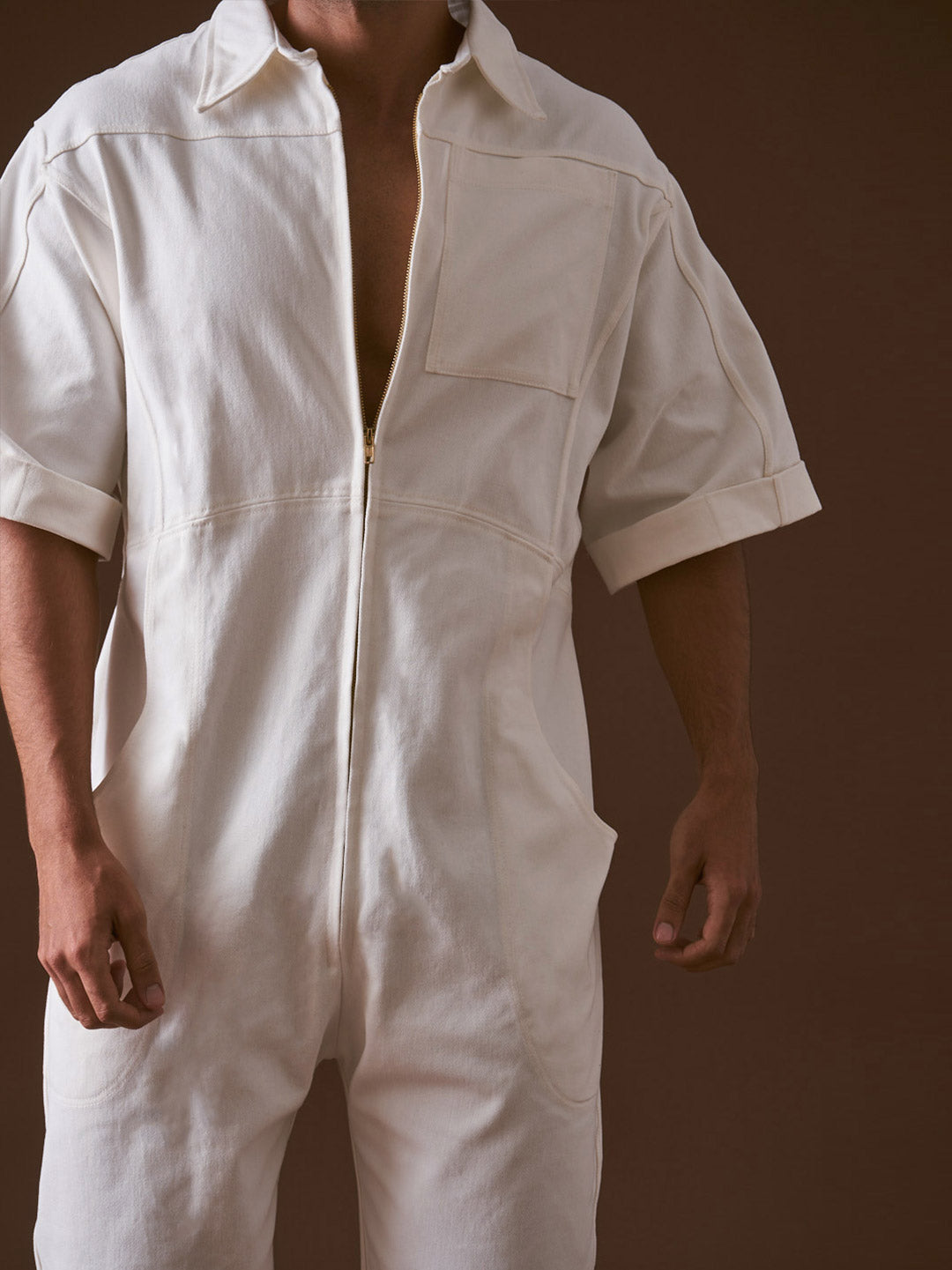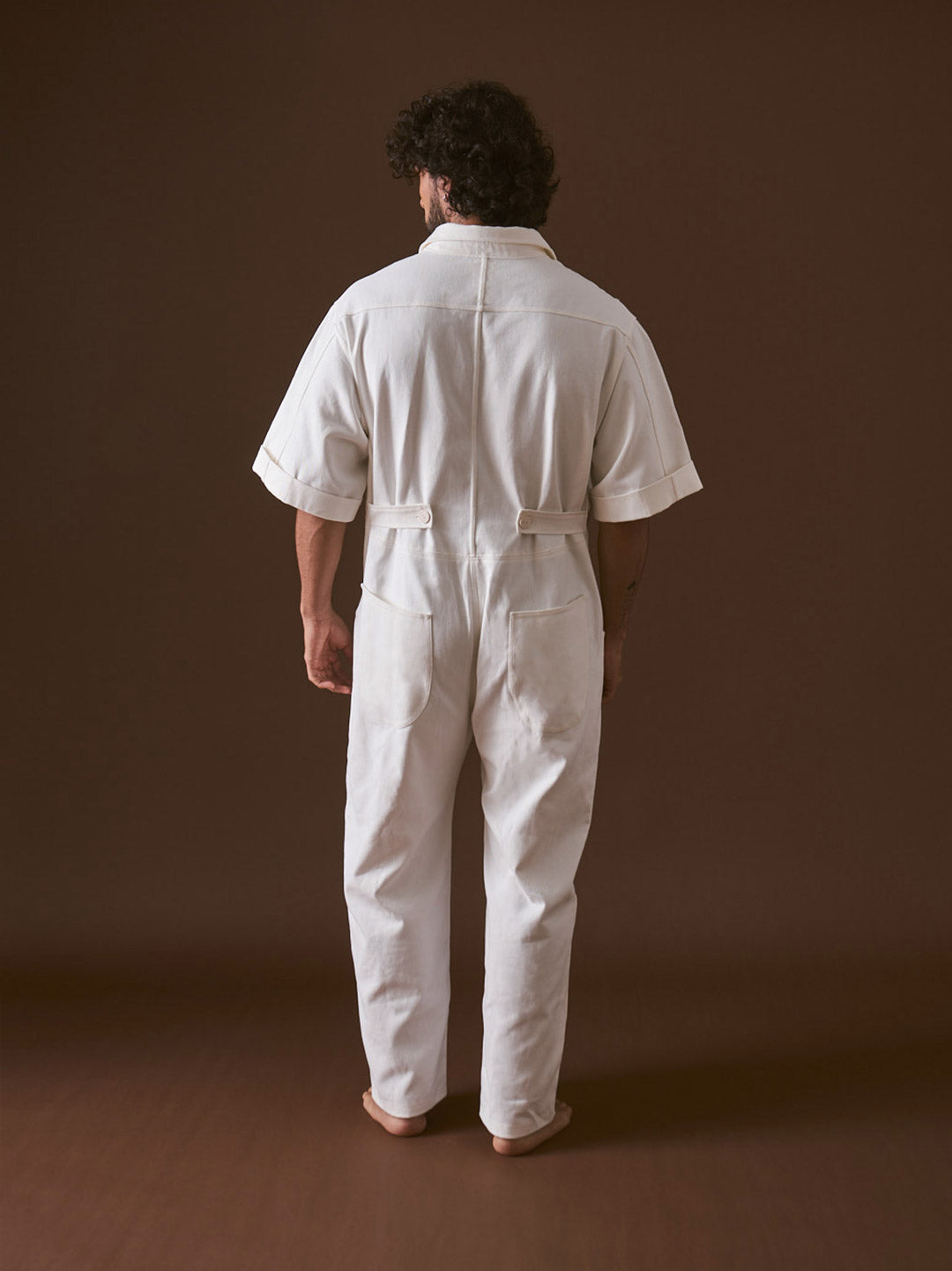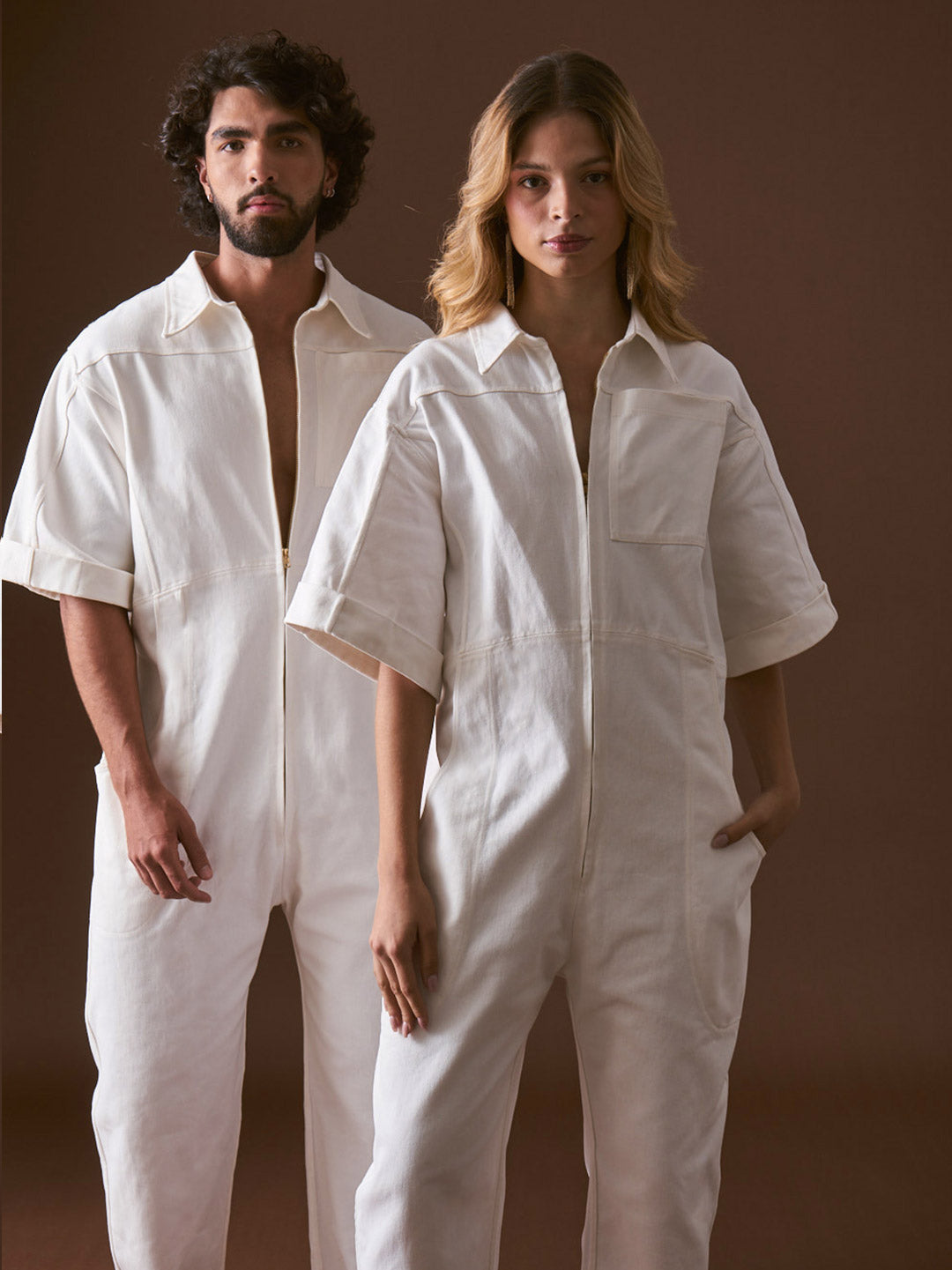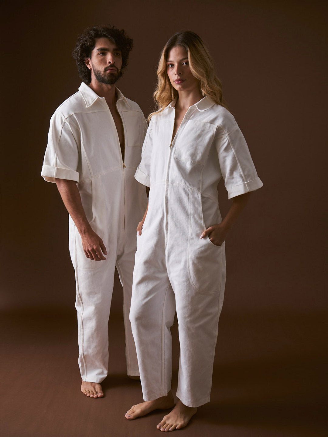 Enterizo sin género, hecho en drill de algodón y confeccionado en hilos 100% algodón. Diseñado con manga 3/4 , cierre delantero y botones en espalda de algodón aglomerado con bioresina.