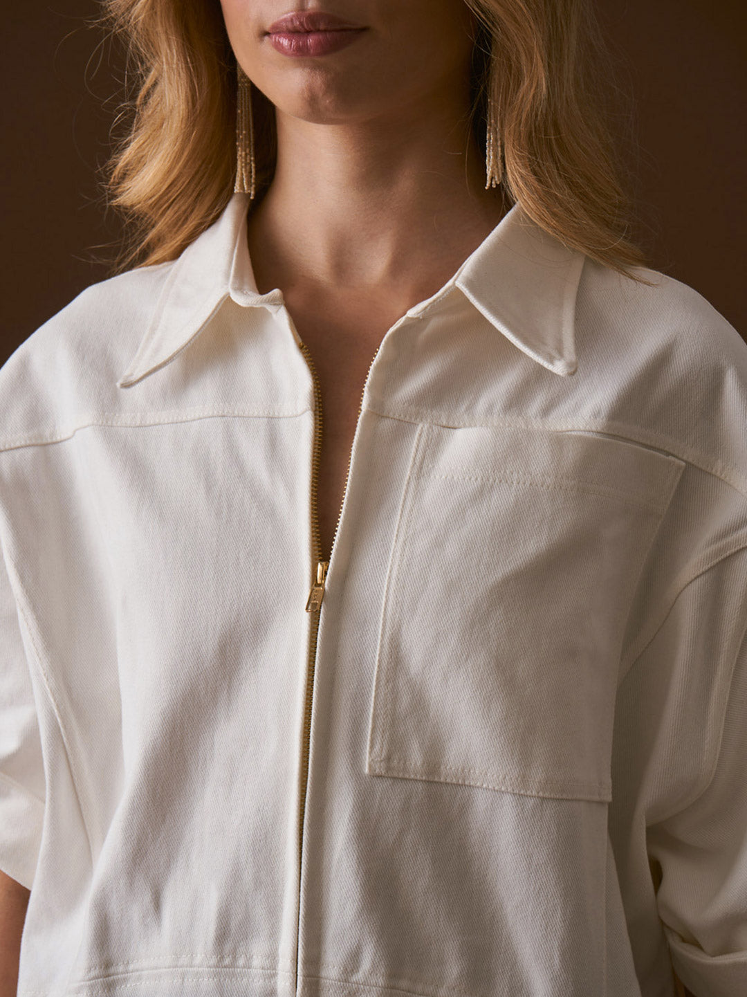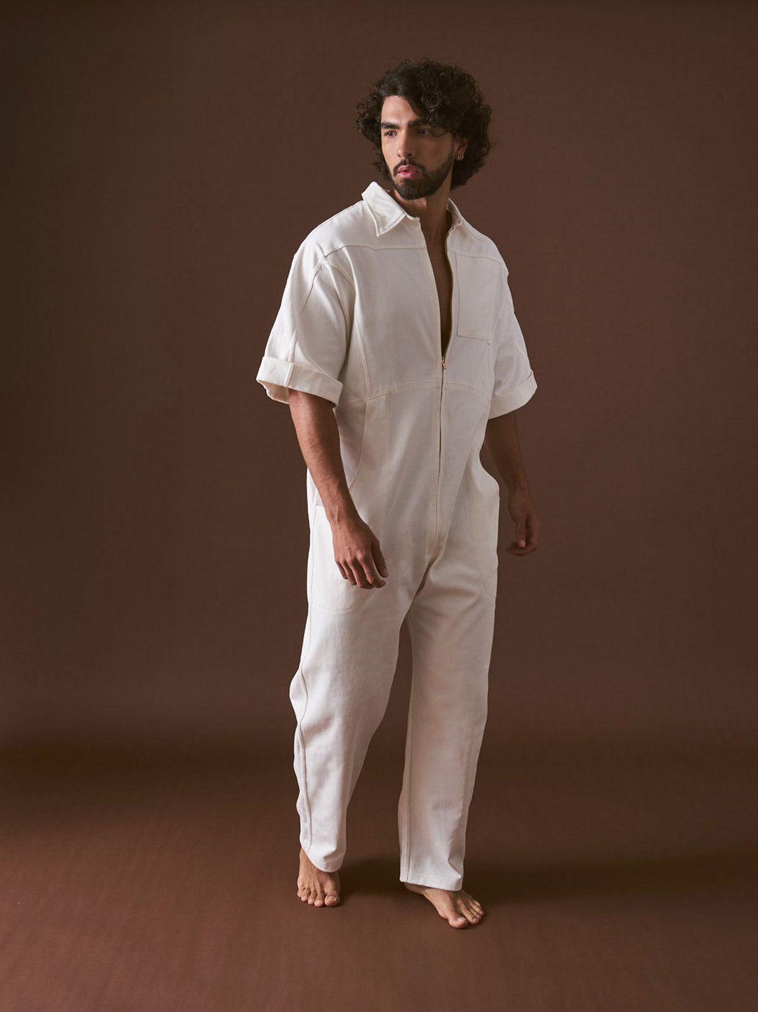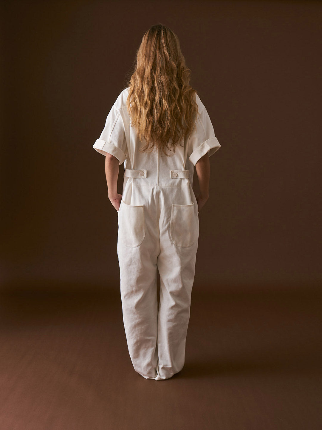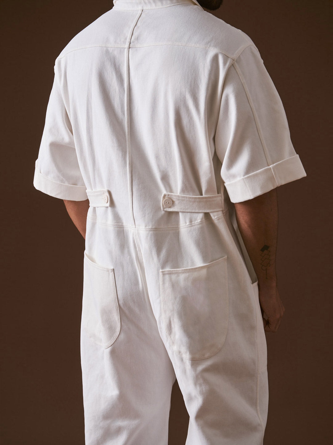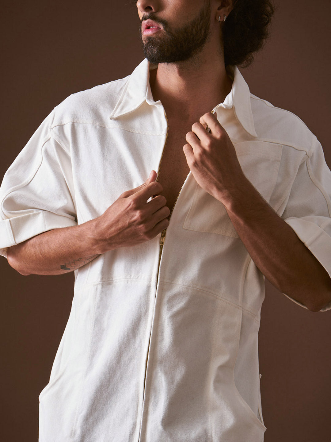 Enterizo sin género, hecho en drill de algodón y confeccionado en hilos 100% algodón. Diseñado con manga 3/4 , cierre delantero y botones en espalda de algodón aglomerado con bioresina.