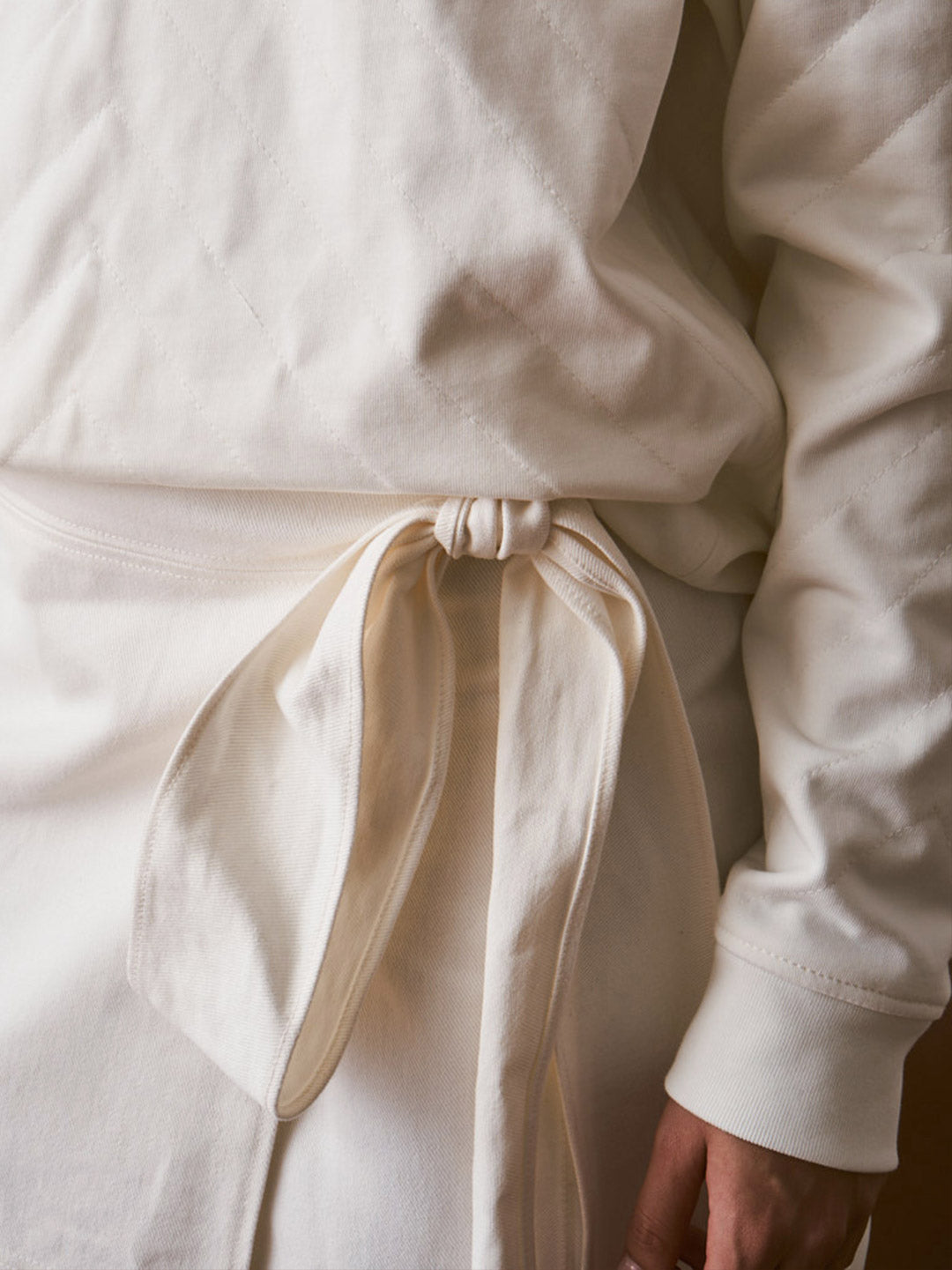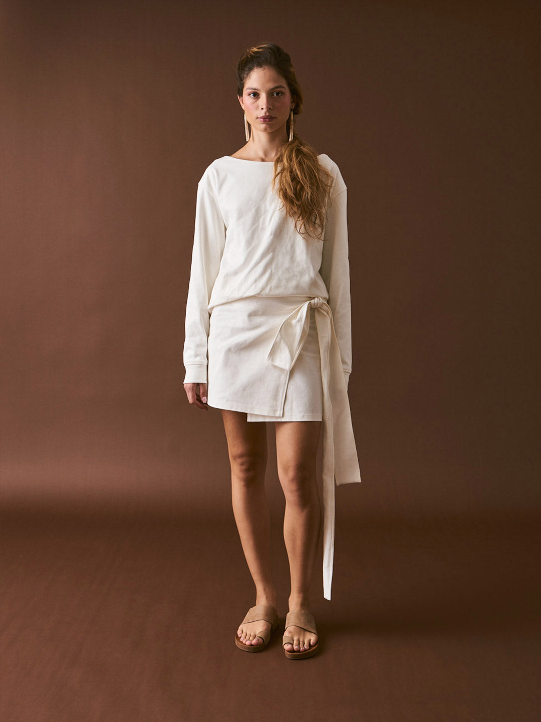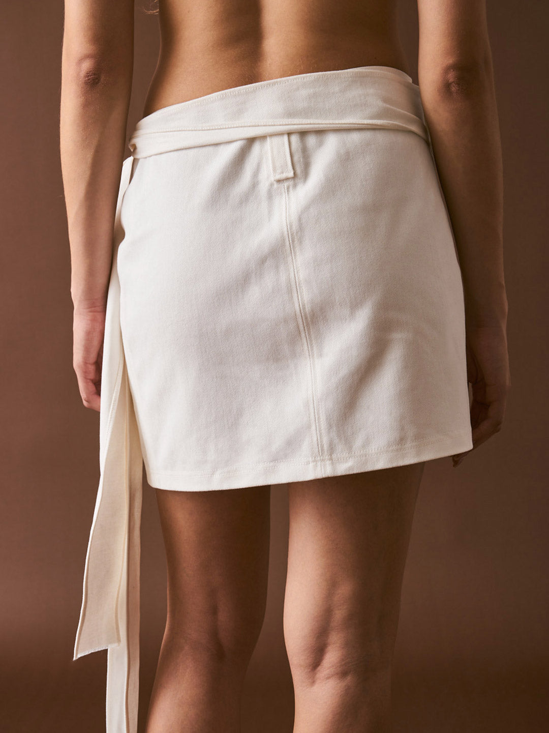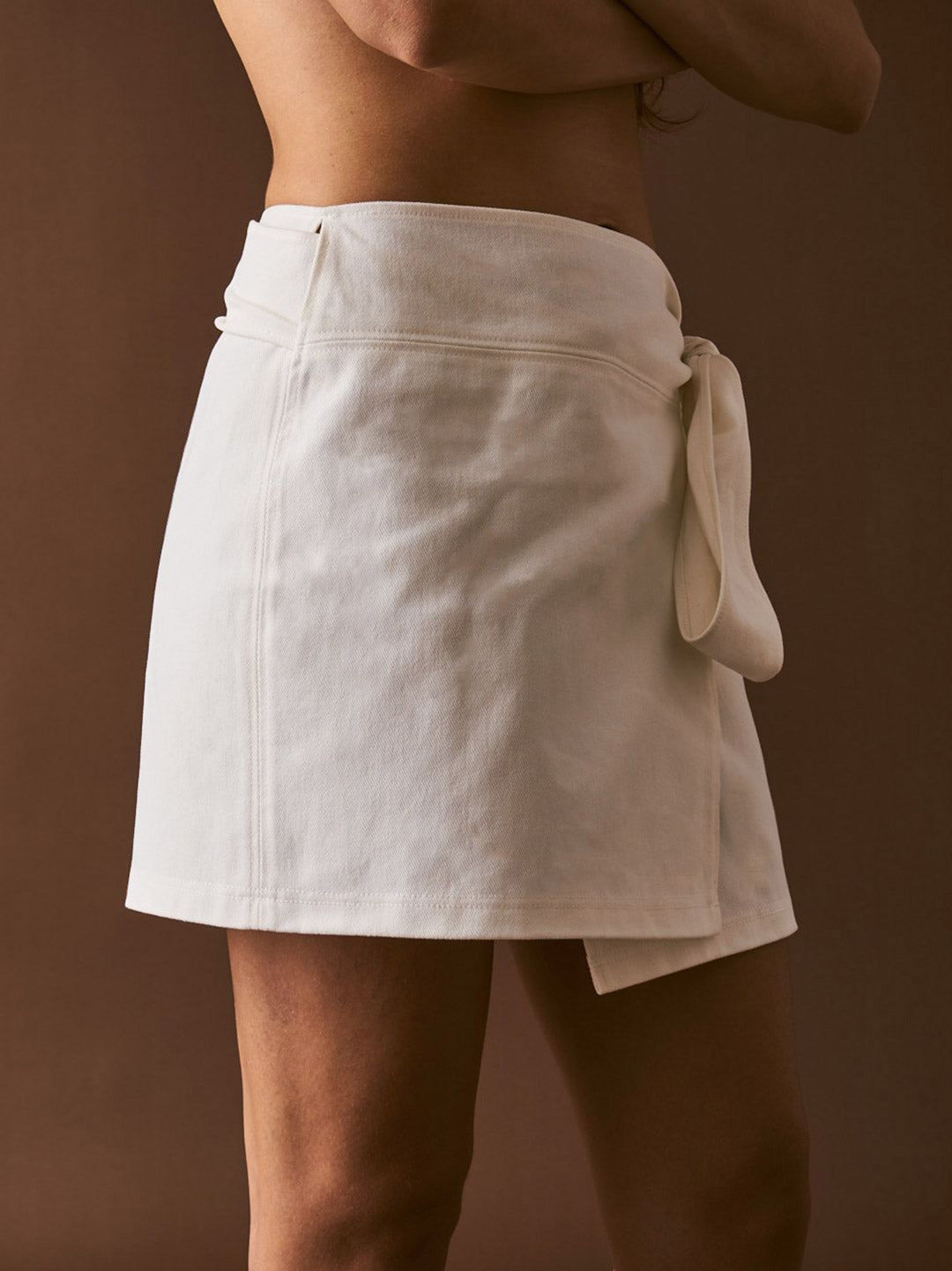 Falda envolvente, color marfil hecha en drill algodón y confeccionada en hilo 100% algodón. Diseñada con tapas asimétricas delanteras y tiras a la cintura para amarrar y ajustar.