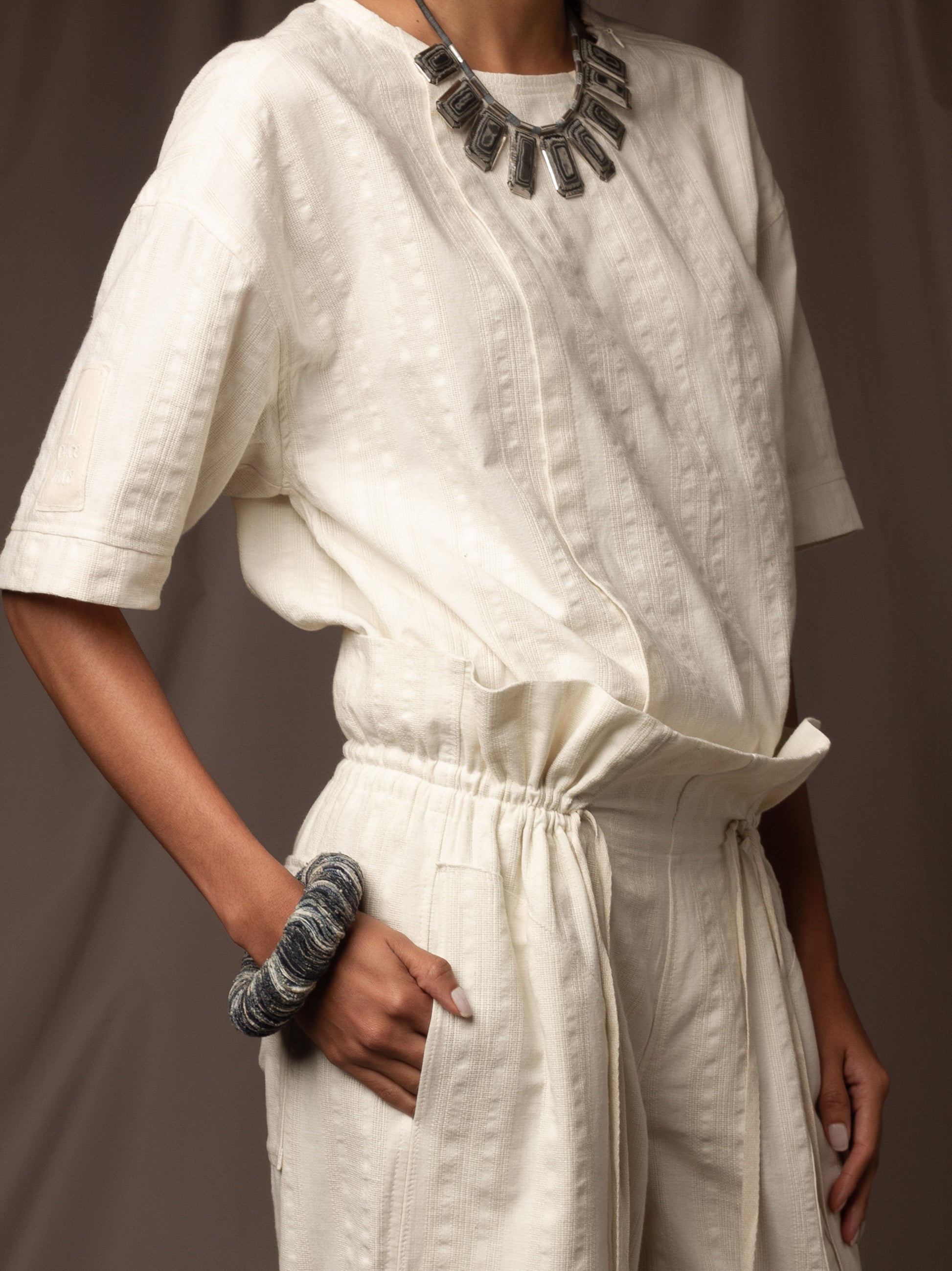 Pantalón sin género, color marfil hecho en tejido plano de algodón y confeccionado en hilo 100% algodón. Diseñado con tiras a la cintura para amarrar y ajustar. El amarre a la altura del tobillo es opcional.